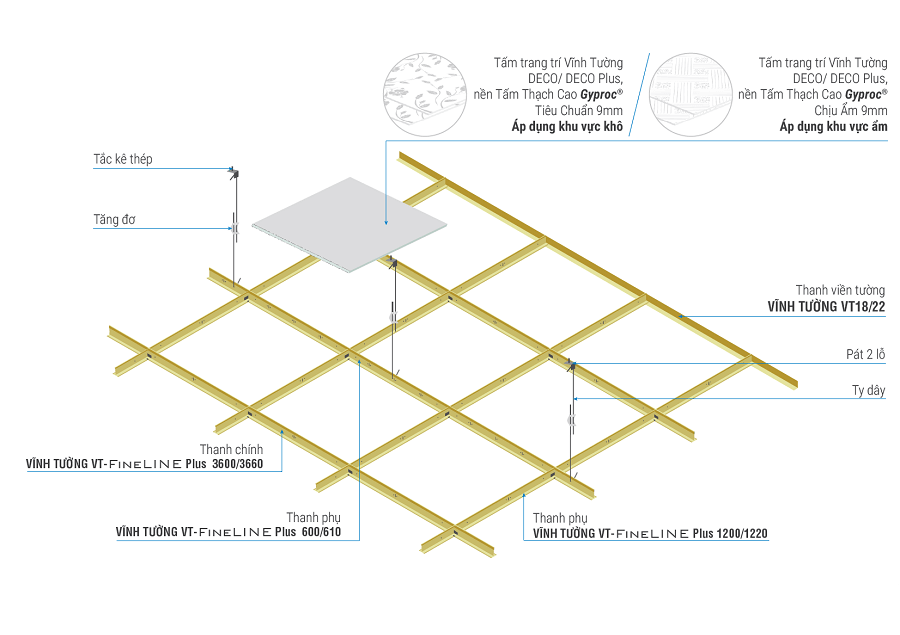 - Phân chia thích hợp khoảng cách tâm điểm giữa thanh chính và thanh phụ. Có thể theo khoảng cách sau: 610mm x 610mm 600mm x 600mm; 610mm x 1220mm 600mm x 1200mm.